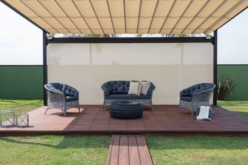 Investir em móveis específicos para áreas externas garante durabilidade e resistência. Camila recomenda móveis em fibra sintética ou madeira tratada, que resistem bem às intempéries. Para um toque de sofisticação, móveis em alumínio ou ferro também são ótimos, pois são leves e não oxidam facilmente. Em um de seus projetos, ela usou um gazebo com deck de madeira combinado com sofás e poltronas estofadas, criando um ambiente elegante e confortável.
