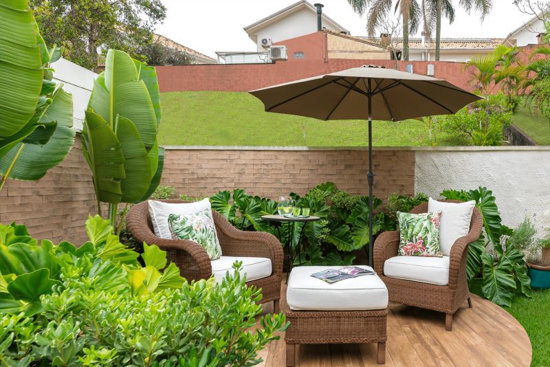 Ombrelones são essenciais para criar sombra e proteção contra o sol intenso da primavera. Eles também adicionam sofisticação ao ambiente. Camila escolheu modelo compacto, que se integram ao paisagismo e oferecem conforto sem ocupar muito espaço. É importante escolher um modelo com estrutura robusta, para resistir ao vento e garantir durabilidade.