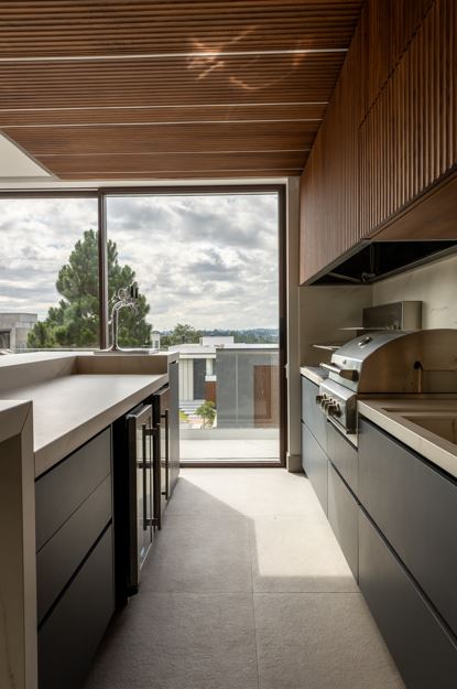 Projeto da Meneghisso & Pasquotto Arquitetura com uma coifa embutida na área gourmet, onde proporciona funcionalidade e higiene para o ambiente integrado à área da piscina | Foto: JP Image
