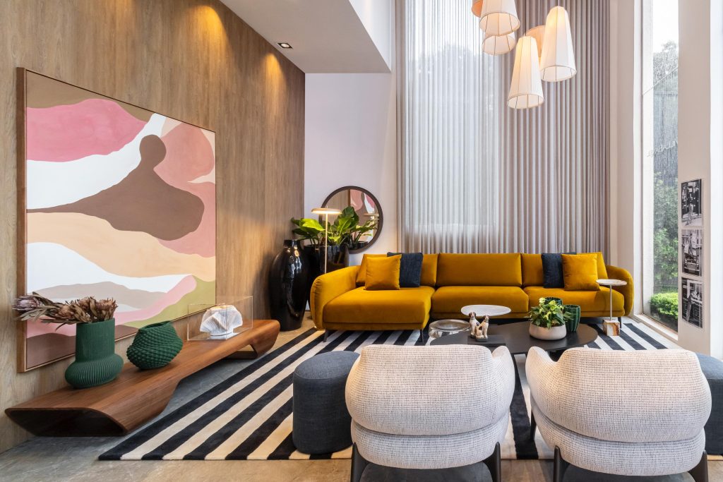 O olhar da profissional imprime leveza e dinamismo, sem abrir mão da identidade. O amarelo do sofá Serenite e da poltrona Elysian da Century, surge como pontos de energia, enquanto o verde profundo da parede cria ancoragem e equilíbrio. No chão, o tapete em estampa de zebra abraça a sala com elegância disruptiva, um gesto ousado que une conforto e personalidade.