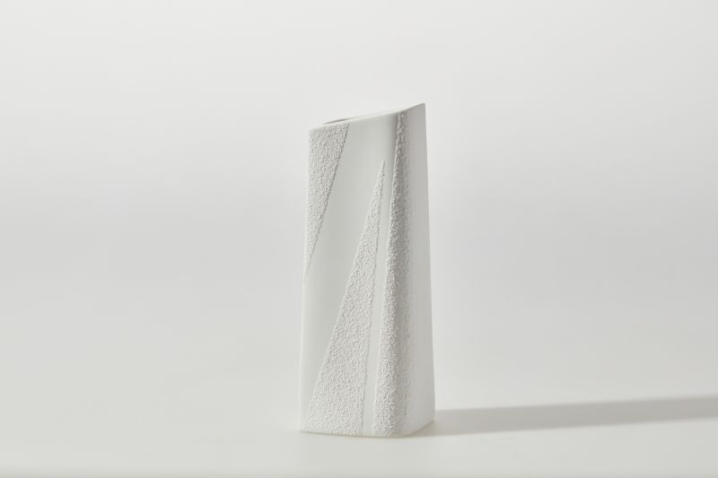 A coleção Sopro trabalha contrastes entre superfícies lisas e texturas granuladas, criando peças que evocam vento, sopro e passagem. São objetos que parecem conter movimento mesmo em repouso, como se o ar tivesse deixado marcas na porcelana.