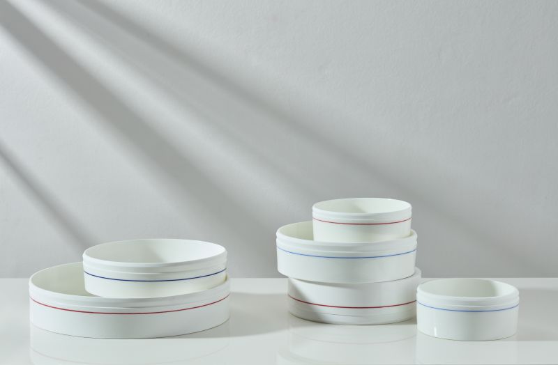 Já a coleção Horizonte propõe amplitude visual e precisão minimalista. Suas peças revelam faixas sutis em azul e vermelho que percorrem a superfície branca como linhas que marcam paisagens distantes. O branco puro opera como campo aberto, uma tela silenciosa onde o olhar pode divagar. É um conjunto que traduz estabilidade, respiração e movimento contínuo.