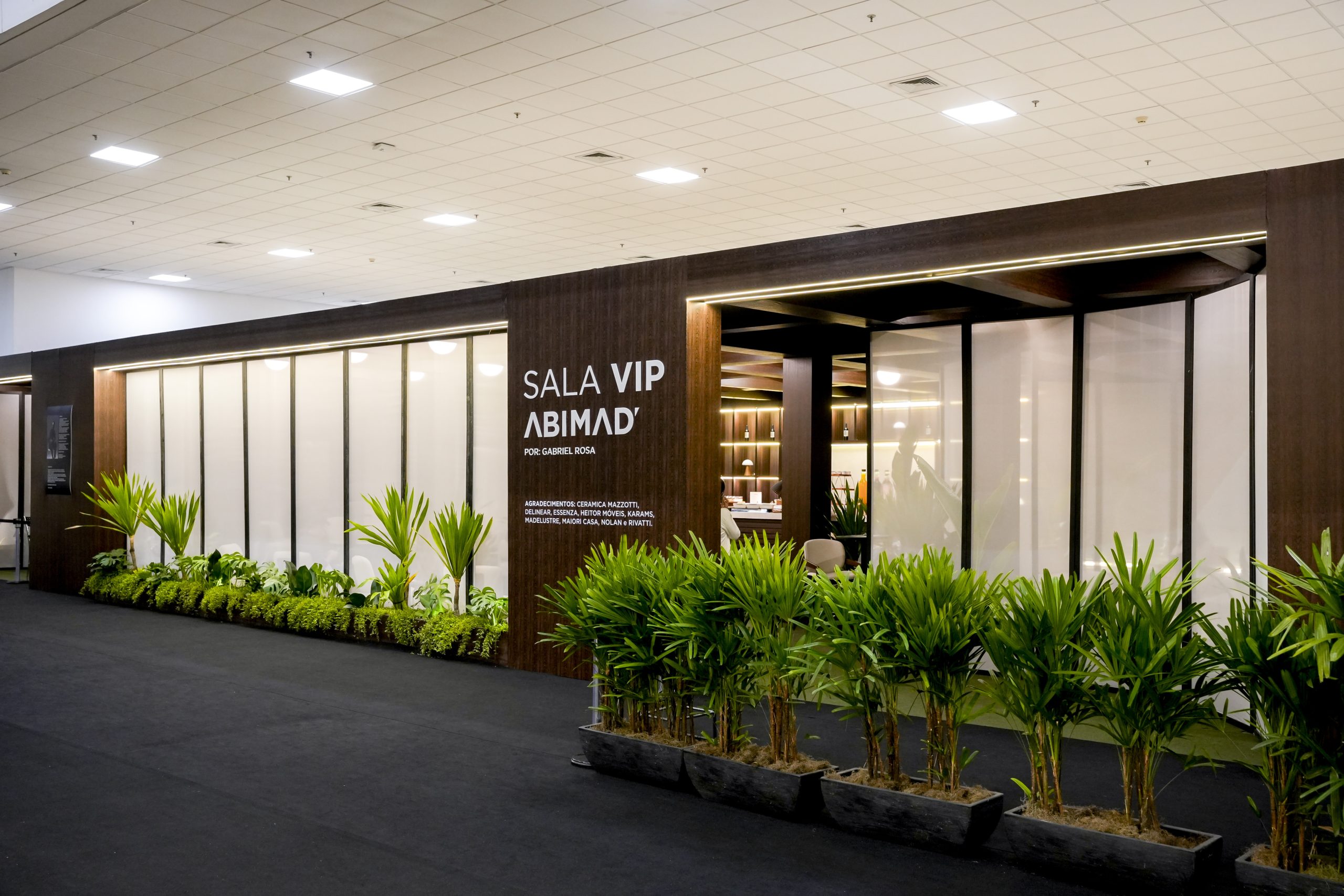 O espaço foi concebido como um verdadeiro refúgio dentro da feira, onde texturas, formas, iluminação e materiais dialogam de maneira harmônica para estimular pausas, encontros e conexões. Dividida entre áreas de estar, bar, refeições e espaços reservados para reuniões, a Sala VIP foi pensada para promover bem-estar e networking em meio à intensa agenda de negócios da ABIMAD.