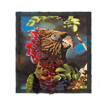 Tapeçaria bordada (1,49 m x 1,19 m) a partir da foto Anacã (Deroptyus accipitrinus), Amazônia – 2013