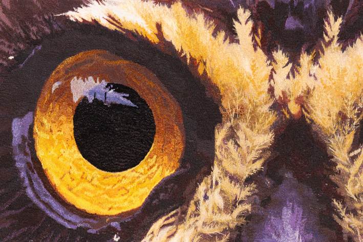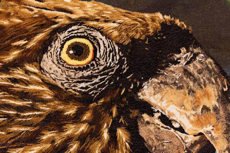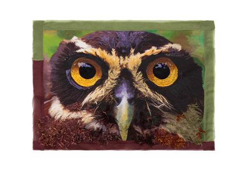 Detalhe da tapeçaria bordada a partir da foto Coruja Murucututu (Pulsatrix perspicillata) – Amazônia – 2010
