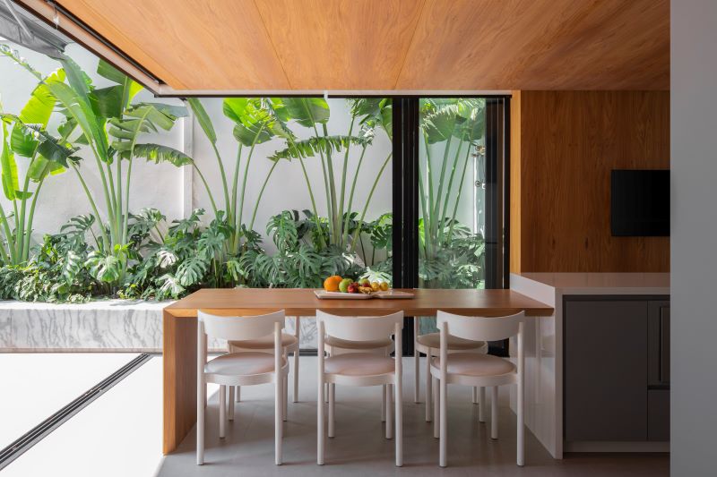 A grande virada veio com a criação da cozinha gourmet: uma estrutura metálica leve, quase como uma caixa de vidro com vista para os dois lados. Na verdade, três. “Ela é toda envidraçada e parece flutuar entre o jardim e o interior”, explica Fontana. A partir dessa estrutura, nasceu também um mezanino que ampliou a área construída em quase 70 metros quadrados. Tudo isso com intervenções precisas, que reorganizam o térreo e criam novas possibilidades de uso no pavimento superior. As janelas do mezanino, com vidro canelado e floreiras, são passagens de luz e ar — pequenos gestos que transformam.