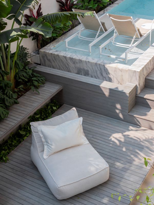 E possibilidades não faltam: o home theater, por exemplo, é também uma suíte, uma sala de TV para o filho ou até um quarto de hóspedes, com portas de correr que permitem abrir ou fechar o ambiente conforme a necessidade. O banheiro dessa suíte é outro coringa: com acesso pela varanda e um chuveiro que também funciona como sauna úmida, ele pode servir de lavabo para eventos, de vestiário para a piscina ou simplesmente como parte do spa particular da casa — que inclui ainda piscina e tanque de gelo.