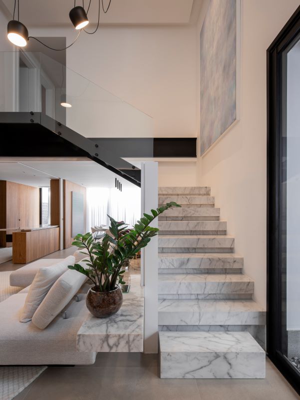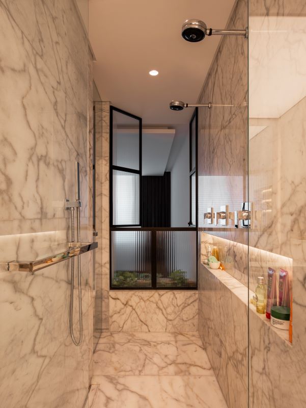 O jardim, como não poderia deixar de ser, é o grande fio condutor. A varanda contorna o térreo todo, e todos os espaços sociais se voltam para esse entorno verde. “Ele é o ponto forte do projeto. A casa gira em torno dele”, comenta Fontana. Entre os acabamentos, destaque para o mármore Carrara — o verdadeiro, como faz questão de pontuar o arquiteto —, que aparece desde a entrada até a sauna, criando unidade visual com elegância e simplicidade.