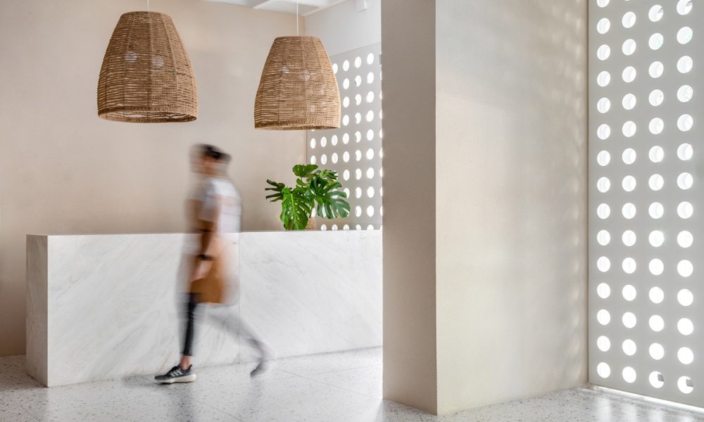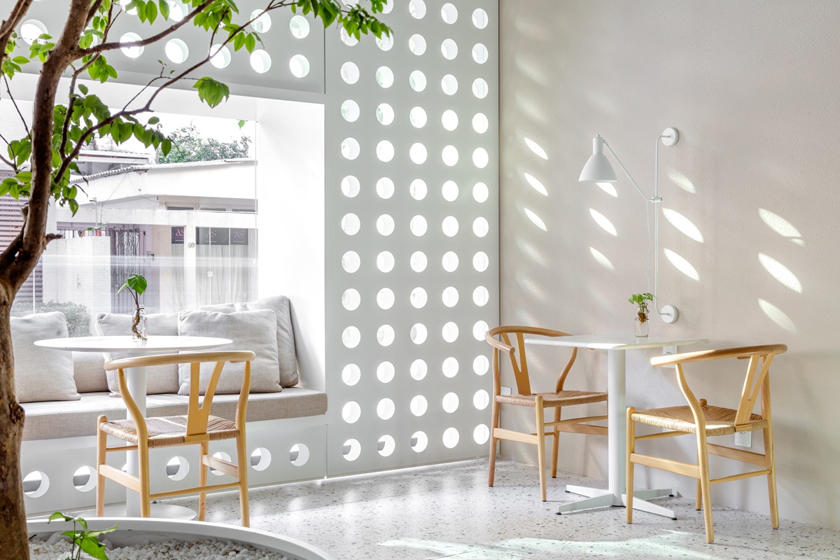 O resultado acompanha uma tendência crescente no setor: ambientes que não competem com o produto, mas o potencializam. “Na Caramelia, o design atua como extensão da experiência gastronômica, convidando o público a desacelerar e ressignificar momentos simples do dia a dia”, explica. O balcão monolítico em mármore branco contrasta com a leveza das luminárias em fibra natural suspensas sobre o atendimento, criando um equilíbrio entre solidez e delicadeza. Já a fachada e as divisórias internas são marcadas por um painel perfurado com aberturas circulares, elemento que filtra a luz natural e projeta desenhos orgânicos ao longo do dia.