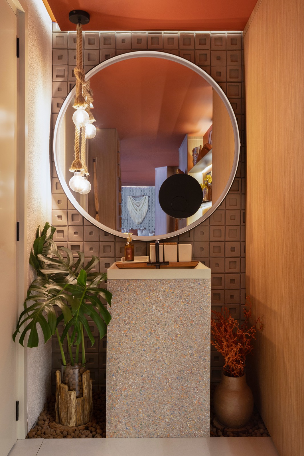 “Não vejo contradição nisso”, esclarece a designer. “A tecnologia deve servir à vida, assim como a tradição. O espelho Ojo responde às necessidades de quem vive em apartamentos pequenos, precisa otimizar espaços, vive conectado. Mas mantém a sensibilidade brasileira no desenho, na escolha dos materiais.”