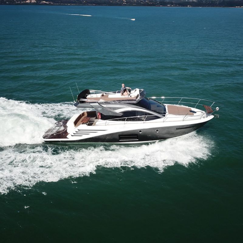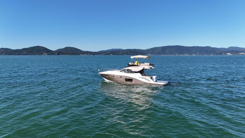Já o modelo de 46 pés, com três pavimentos, se destaca pela imponência e pelas dimensões: são mais de 14 metros de comprimento e 4 metros de largura, o que resulta em ambientes internos amplos, com cabines espaçosas, banheiros confortáveis e cockpit generoso. O iate oferece áreas de circulação largas e um flybridge com solário, sofá em “U” e segundo posto de comando. A lotação é de até 15 pessoas durante o dia e 6 para pernoite, ideal para celebrar o réveillon a bordo.