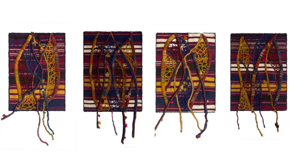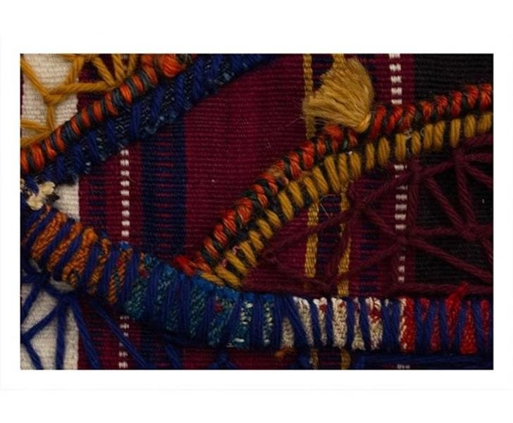 Até mesmo as bordas de fragmentos de tapetes foram reaproveitadas, ganhando nas tapeçarias um protagonismo artístico único a cada peça, onde nuances de movimento e tridimensionalidade parecem flutuar.