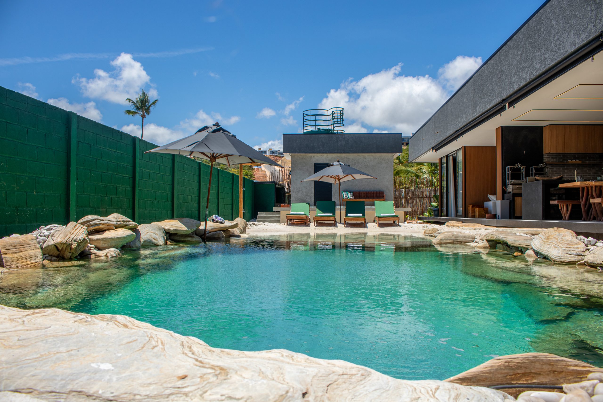 cal Brasil e outras ONGs parceiras, uma iniciativa que reforça o compromisso da Fuplastic com a economia circular. Com 18 mil blocos sustentáveis, a Casa Milagres 9.0 soma 450 m² de área construída e abriga seis suítes integradas por um amplo vão central, unindo conforto e eficiência climática. Um dos grandes destaques é a piscina, que substitui o concreto por um lago naturalizado de 100 m², em perfeita harmonia com a paisagem local. Essa escolha evitou o uso de mais de 60 m³ de concreto, material cuja produção é responsável por grandes volumes de emissões de CO₂ e degradação ambiental.