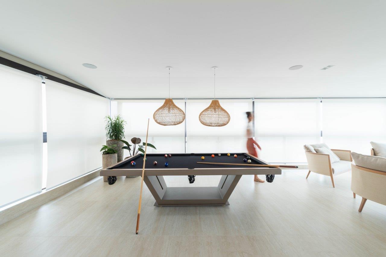 Em parceria com Alma Light, foi desenvolvido um projeto luminotécnico inteligente, com sistemas de LED integrados, que une conforto e funcionalidade, reforçando a atmosfera litorânea da cobertura.