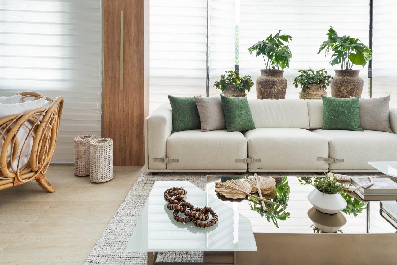 Os revestimentos internos combinam envelopamentos de madeira e texturas leves, equilibrando a sensação de uma residência de praia com um design contemporâneo sofisticado. Tecidos naturais, linhos e tapetes com tramas suaves dialogam com cortinas e persianas puras, criando uma atmosfera de acolhimento e leveza. A escolha dos materiais valoriza a praticidade do dia a dia e, ao mesmo tempo, garante conforto, reforçando a conexão afetiva da família com o espaço. Todo o mobiliário solto é da Artefacto, com design assinado, contribuindo para a estética elegante e harmoniosa do projeto.