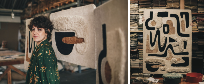 Tapeçarias feitas de fragmentos de tapetes reaproveitados reinterpretam paisagens vistas de cima. Em processo 100% manual, transformam resíduos em grafismos contemplativos.