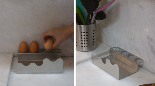 Apoio de cozinha em aço inox dobrado a partir de uma única chapa. O objeto organiza talheres e acomoda ovos, funcionando como estação entre despensa e preparo. Disponível em versões compacta e ampliada.