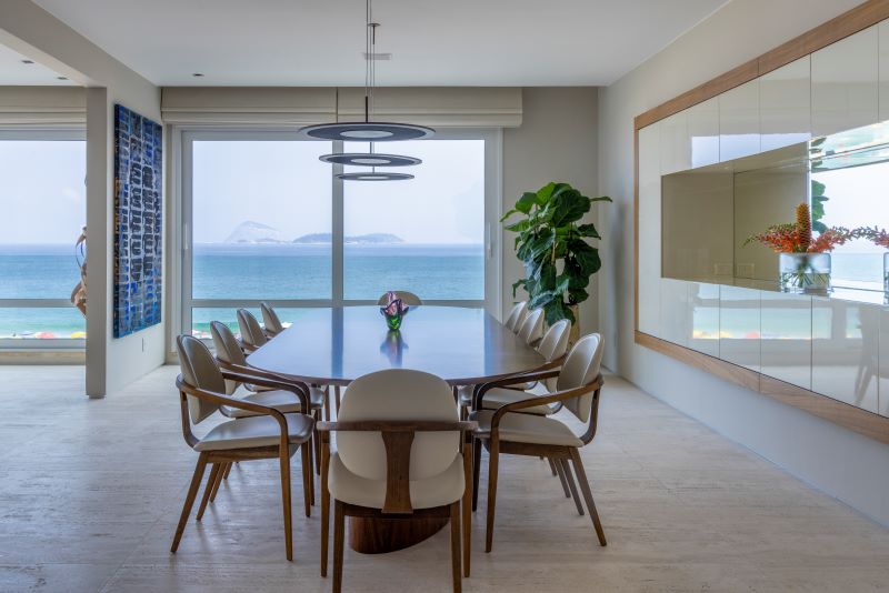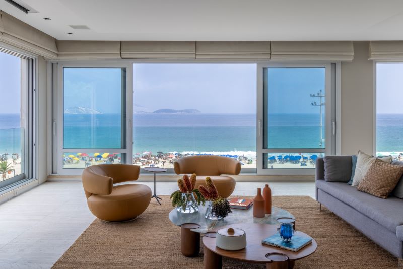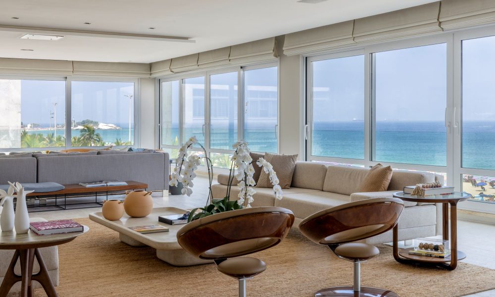 O layout da sala ampla, com grandes janelas em L, foi aproveitado pela arquiteta que criou neste grande living dois ambientes de estar centrais que deixam as laterais como áreas de circulação, uma forma de trazer fluidez ao design. Móveis orgânicos e um pouco mais baixos privilegiam a vista para o mar, presente em toda a área social que tem ainda sala de jantar e home-theater