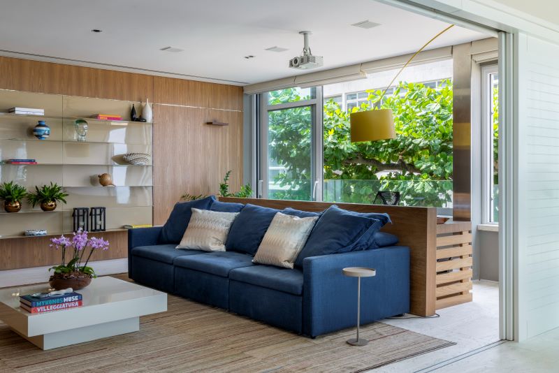 Materiais nobres como mármore e madeira, tapetes persas e móveis de design assinado como a estante de Jader Almeida, no home-theater, e as poltronas Anel, de Ricardo Fasanello, ajudam a trazer ainda mais personalidade ao design de interiores que tem o estilo contemporâneo que é a marca dos projetos de Andrea.