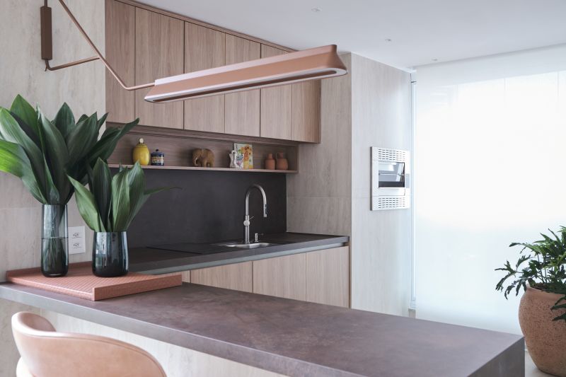 “Queríamos que a cozinha fosse prática, mas também afetiva. É o lugar das conversas, dos cafés e das boas lembranças em família”, explica Thiago, sócio de Michelle.
