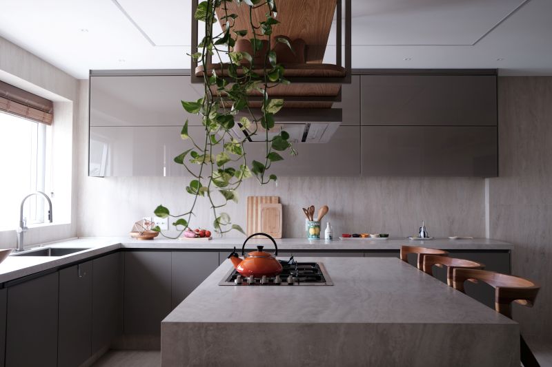 A cozinha, considerada o coração do projeto, foi desenhada para unir funcionalidade e afeto. O ambiente ganhou uma ilha central com fogão e banquetas, ideal para refeições rápidas e para acompanhar o preparo dos pratos.