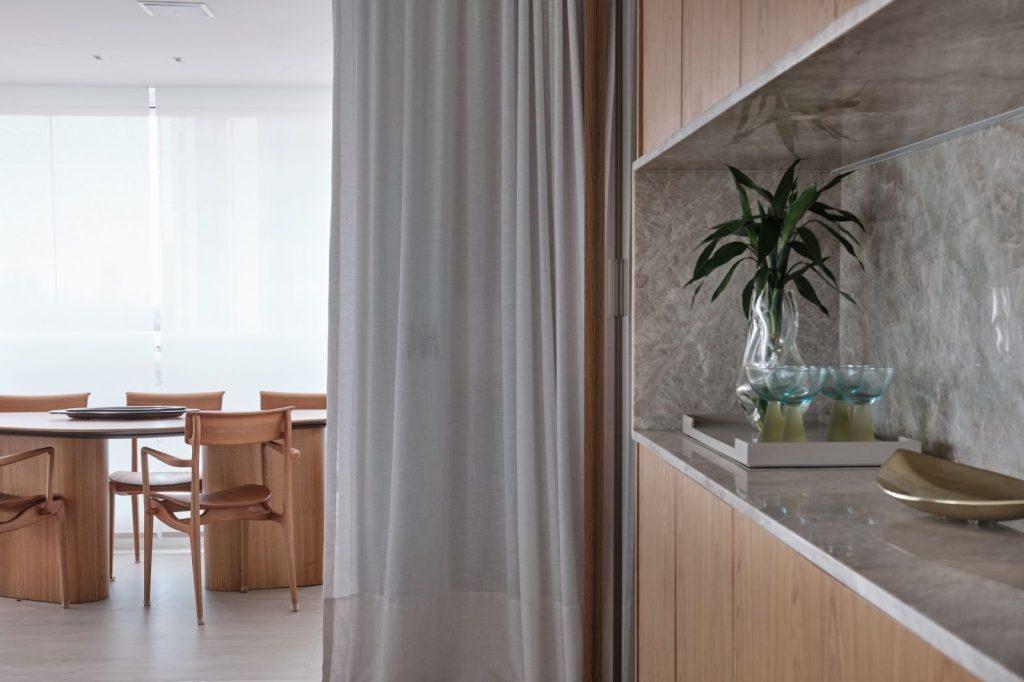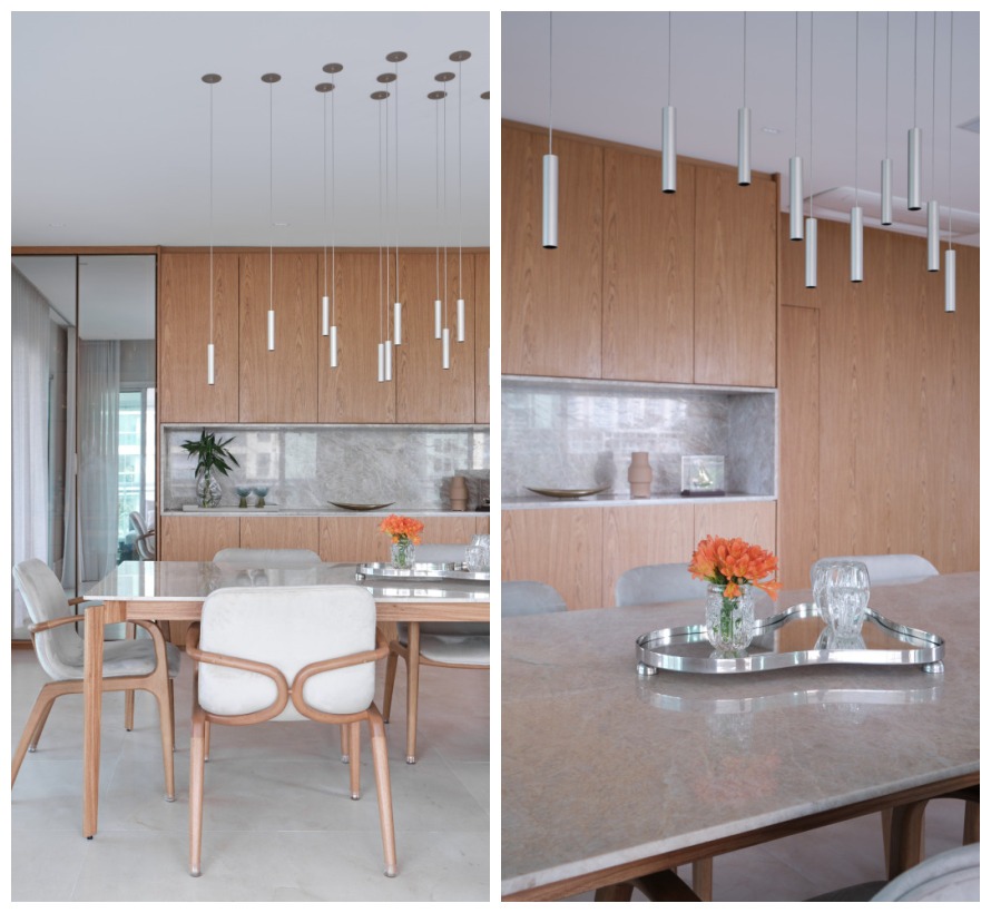 “A luz natural foi uma das protagonistas do projeto. Buscamos ressaltar essa claridade carioca com uma paleta de tons terrosos e neutros, materiais naturais e texturas quentes, como a madeira freijó e o quartzito Taj Mahal”, explicam os arquitetos.