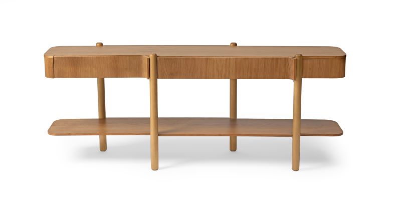 A peça combina referências do mobiliário vintage com a linguagem limpa do design contemporâneo. Tanto o gaveteiro quanto a prateleira inferior podem receber acabamento em lâmina natural de madeira ou MDF laqueado.
