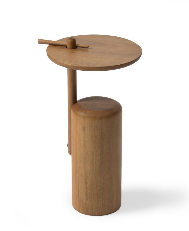 Com base cilíndrica em madeira maciça e haste torneada que simboliza a transformação da matéria, a mesa revela sua essência no ponto de união: uma pequena trava em madeira, que funciona como suporte para objetos e representa um gesto poético do fazer manual. A Flepa traduz a beleza dos pequenos imprevistos e o valor do cuidado artesanal.