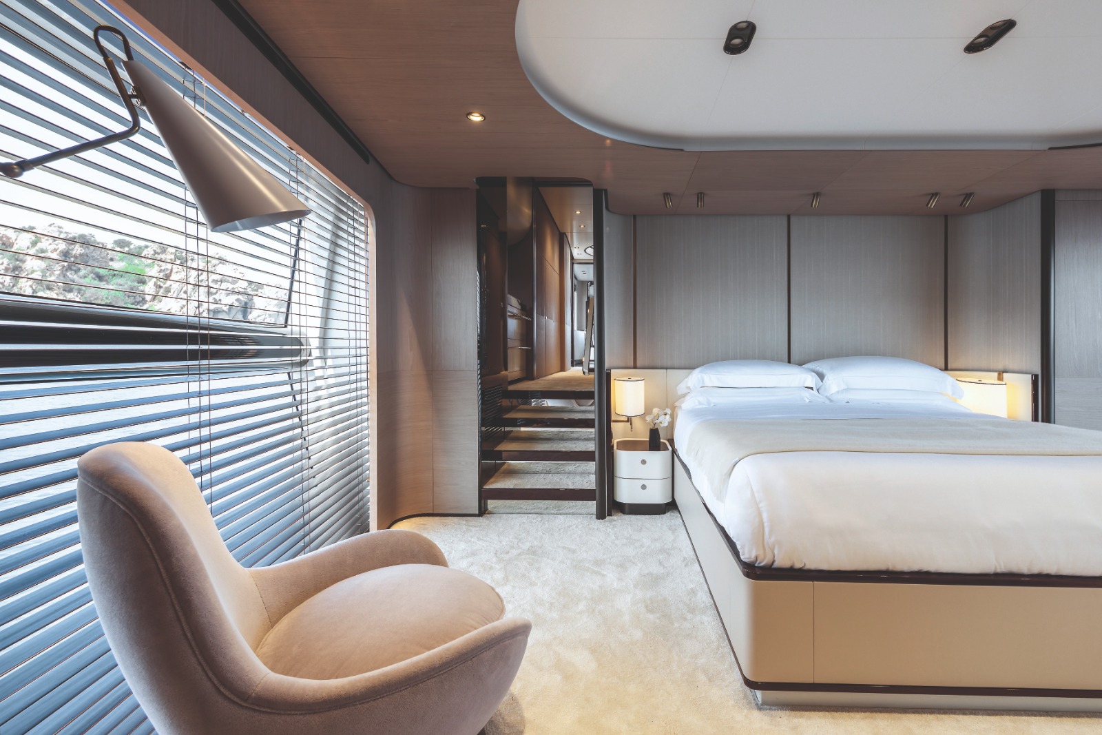 Os interiores substituem linhas rígidas por formas orgânicas e materiais naturais. O projeto da Azimut Grande 25 Metri utiliza madeiras claras (carvalho e nogueira lavada) e mármore Rain Forest em painéis e acabamentos. Janelas panorâmicas maximizam a entrada de luz natural.