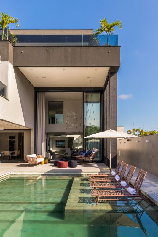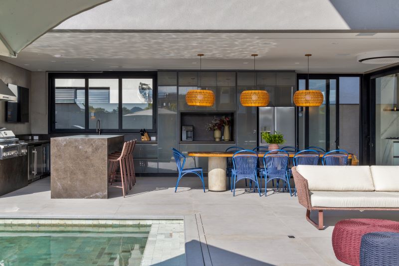Na área externa, a piscina é o grande ponto de encontro da casa, abraçada por um projeto que privilegia o convívio e o lazer. Ao lado dela, a churrasqueira integrada e o mobiliário generoso criam um ambiente perfeito para reunir amigos e familiares em momentos descontraídos, sempre com muito estilo. Sofás confortáveis, espreguiçadeiras e mesas de apoio foram dispostos de forma estratégica, permitindo diferentes usos e garantindo o bem-estar em qualquer ocasião.