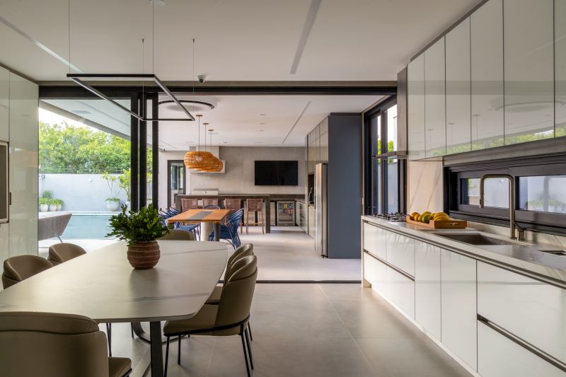 Já a cozinha, em branco absoluto, recebeu materiais tecnológicos que unem frescor visual e praticidade, acompanhando o ritmo descontraído da casa.