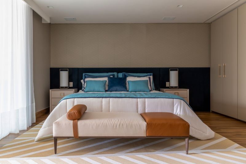 Na área íntima, o quarto do casal foi desenhado para transmitir calma e aconchego. A paleta suave em tons claros cria a base perfeita para a cabeceira em linho azul-marinho, que evoca a brisa do mar e traz uma atmosfera de frescor e sofisticação.