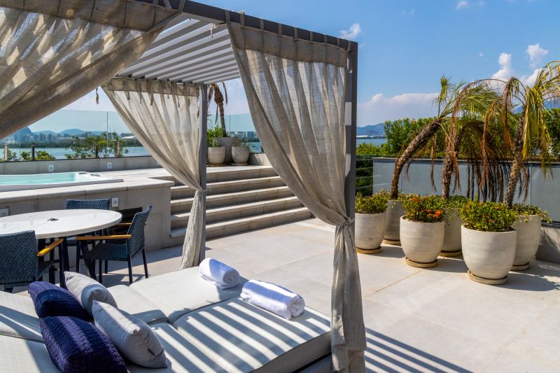 Como extensão desse refúgio, a varanda privativa ganhou ares de spa. Hidromassagem e bangalô se unem em um espaço pensado para desacelerar, contemplar a paisagem e viver momentos de relaxamento absoluto, como se todos os dias fossem férias.