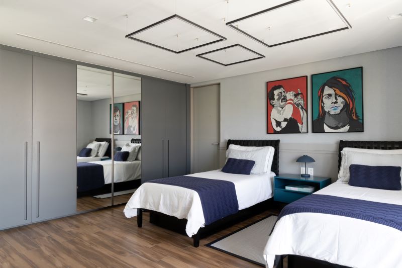 Já o quarto do filho traz versatilidade e identidade, com duas camas de solteiro e quadros que homenageiam ícones do rock.