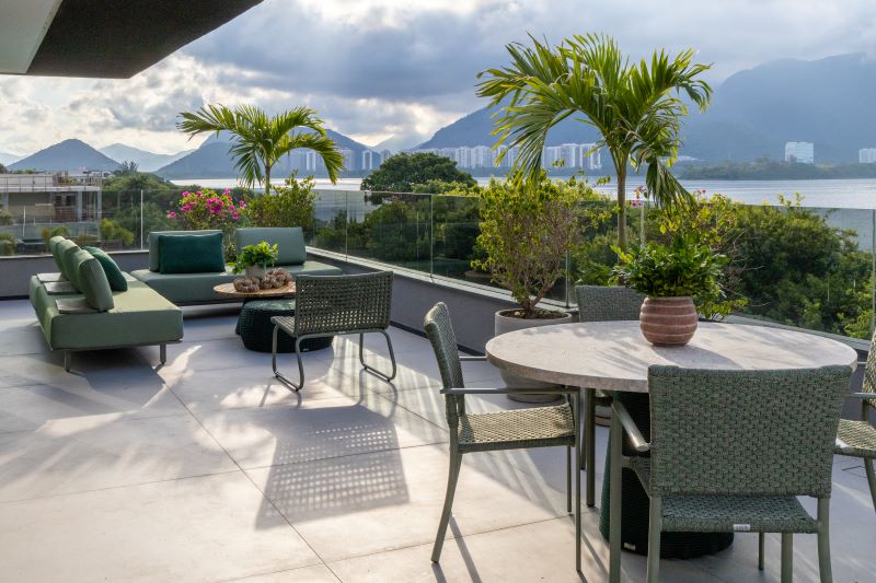 O rooftop fecha o projeto com uma atmosfera descontraída: mobiliário em verde, feito em tecido tecnológico resistente ao sol e à chuva, ideal para receber amigos ou simplesmente aproveitar a vista.