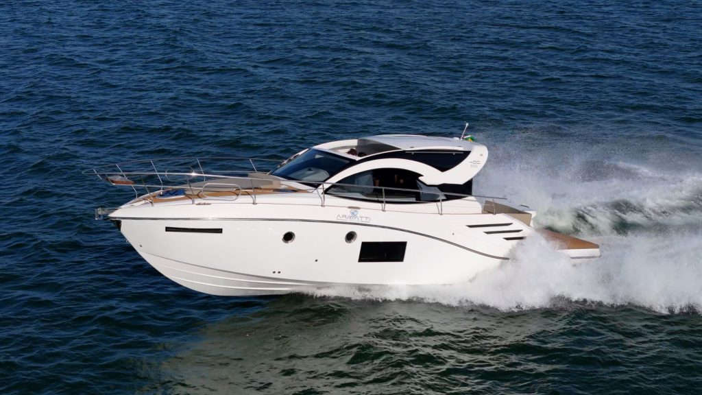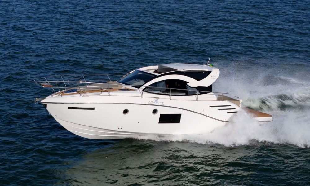 A Armatti 400 Sport Coupé, com 40 pés e 3,3 metros de largura, se destaca por ser uma das mais sofisticadas embarcações de sua categoria. O modelo oferece dois quartos com quase dois metros de altura, além de sala de estar integrada, banheiro com box fechado e uma suíte principal na meia-nau com cama de 2 metros, sofá e baú lateral. O cockpit integra ambientes internos e externos e conta com chaise estrategicamente posicionada para relaxamento. O hard top elétrico amplia a conexão com o mar e garante versatilidade para diferentes condições climáticas. Com preço a partir de R$ 2,5 milhões, a 400 Sport Coupé já conta com diversas unidades vendidas.