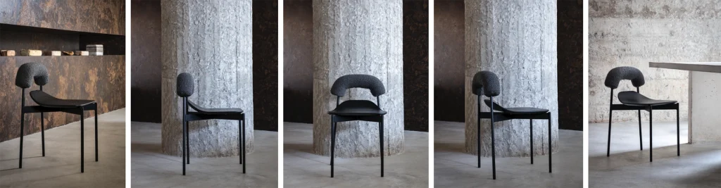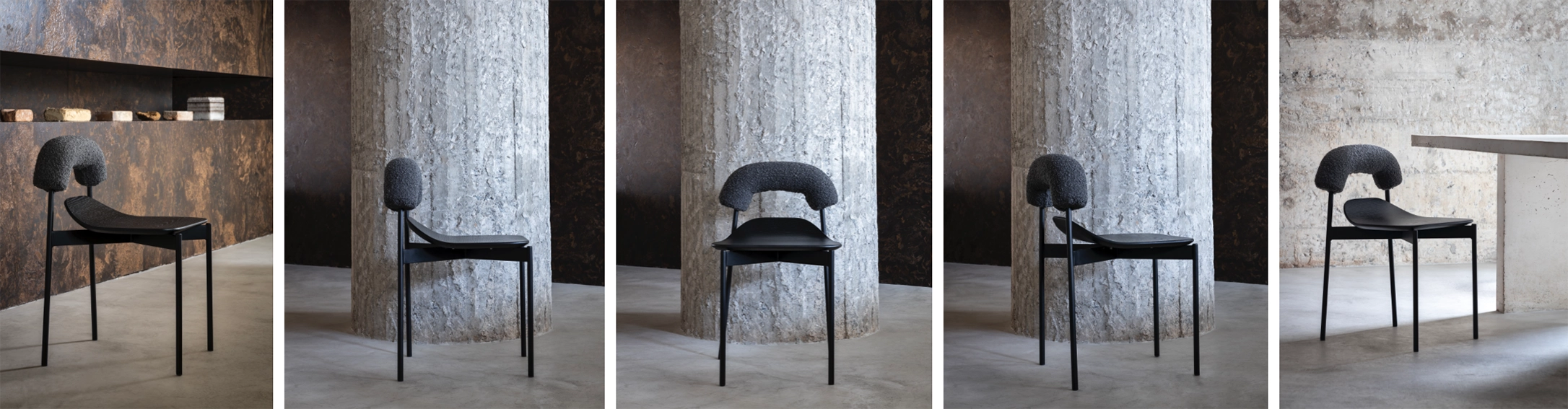Nada na cadeira é literal. O encosto fechado e curto sugere contenção e invisibilidade. O assento sinuoso acolhe o corpo com ambiguidade, entre conforto e tensão. Os pés posteriores rompem com a lógica da simetria. As proporções desafiam padrões clássicos, instigando o olhar.