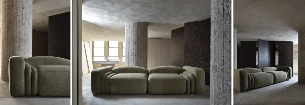A inspiração está na forma e na essência. Os volumes do sofá se expandem e se retraem como fole de acordeom, criando diferentes possibilidades de uso. Os tecidos naturais são combinados com uma paleta cromática livre, que rompe com a previsibilidade do bege, do off-white e do cinza. Mais do que um assento, o Acordeon é uma partitura visual. Uma celebração do corpo em repouso e do afeto em movimento.