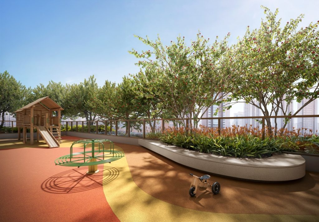 O projeto também aposta em um paisagismo com árvores frutíferas e vegetação nativa, que leva o perfume e o frescor da natureza para o cotidiano dos moradores. Essa integração entre natureza e arquitetura dialoga com princípios do design biofílico, cuja aplicação, segundo estudos revisados pela Frontiers in Psychology (2023), está associada à redução de estresse, melhora no humor e aumento da sensação de conforto nos espaços habitados.