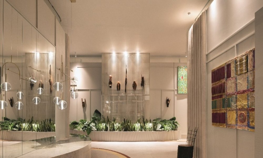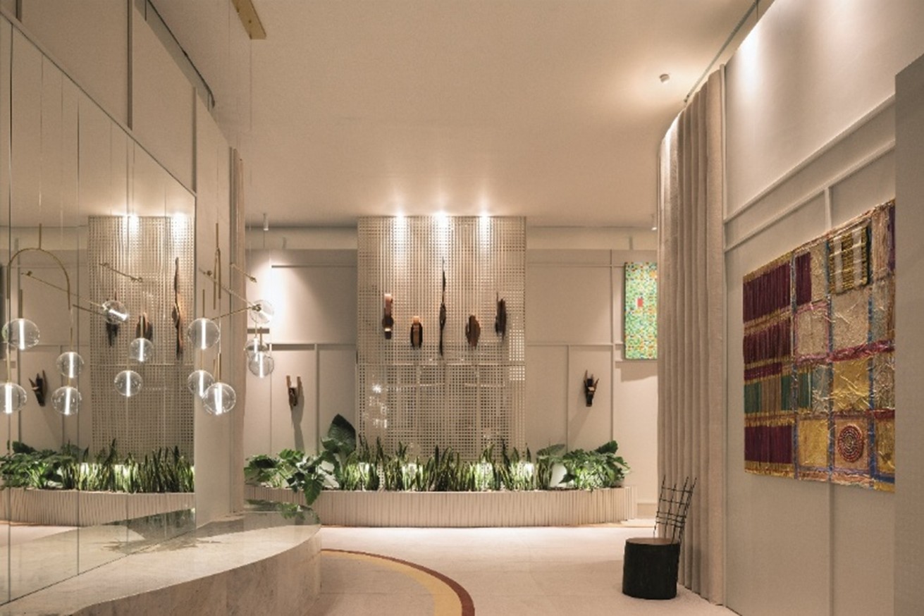 O espaço combina áreas de descanso, mobiliário de design brasileiro e uma ala especial dedicada à Galeria Luciana Brito, com um espaço tipo estúdio para recepção de clientes e curadoria de obras. A paleta neutra e os materiais naturais dialogam com um mobiliário leve, orgânico e expressivo, como os bancos em pedra Paraná desenhados pelo próprio arquiteto.