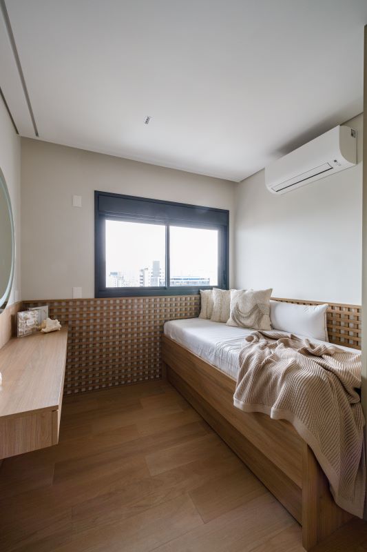 Na área íntima, a suíte principal, agora ampliada com a sacada, exibe uma cabeceira em muxarabi com tela tensionada retroiluminada, cama sob medida e armário com portas de vidro. O papel de parede em linho complementa o ambiente com textura e aconchego. O quarto das filhas segue a mesma linguagem, com marcenaria delicada, penteadeira com espelho iluminado e acabamentos acolhedores.