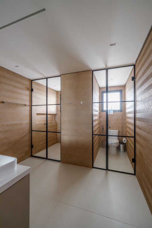 O banheiro principal, revestido do piso ao teto, conta com duas cubas e cabines separadas para chuveiro e bacia sanitária. Já o segundo banheiro ganha um conceito mais clean, com box até o teto e revestimento com tons de verde suave, mantendo a elegância e a continuidade visual do projeto.