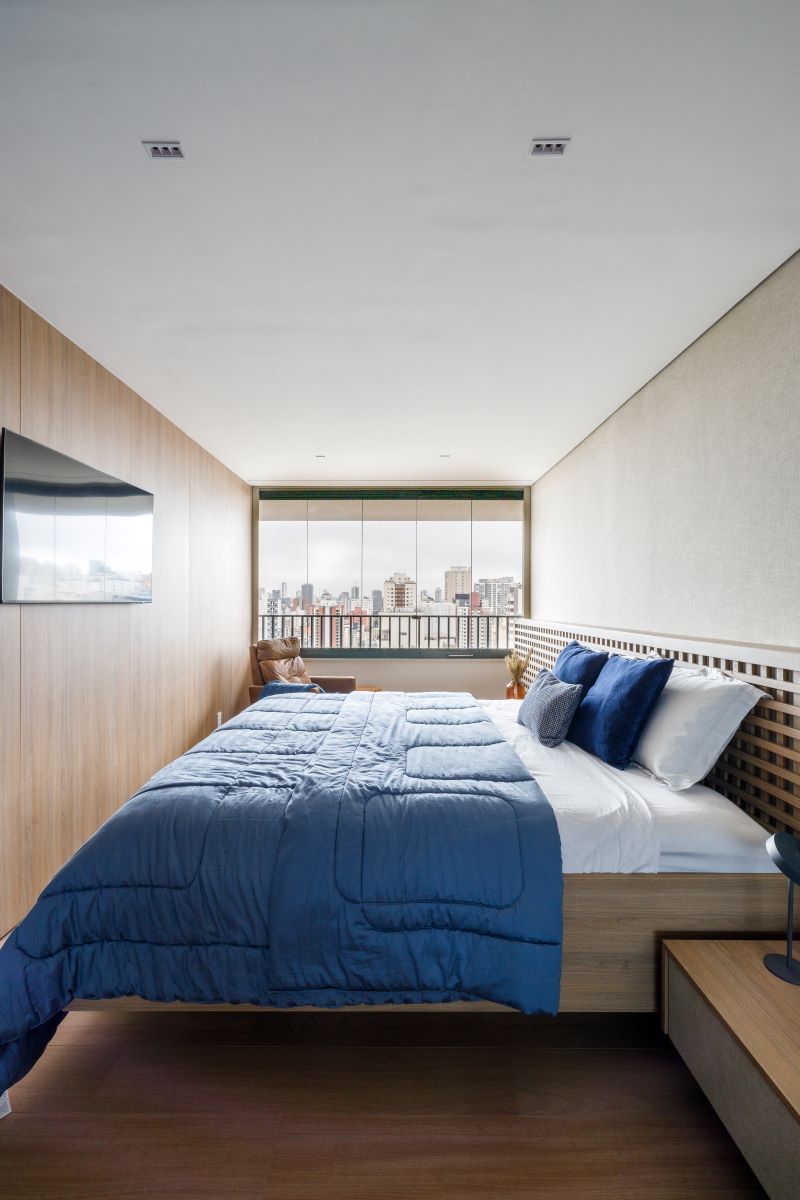 Um dos diferenciais do projeto foi a integração das sacadas à sala e ao quarto, sem alterações estruturais. A remoção das esquadrias e a uniformização dos acabamentos de piso e forro ampliaram os ambientes e reforçaram a conexão entre os espaços, promovendo uma maior entrada de luz natural.