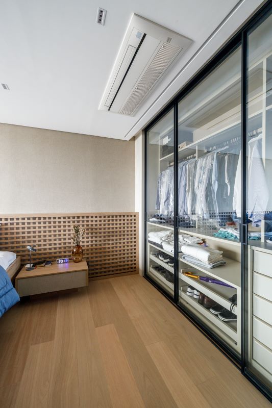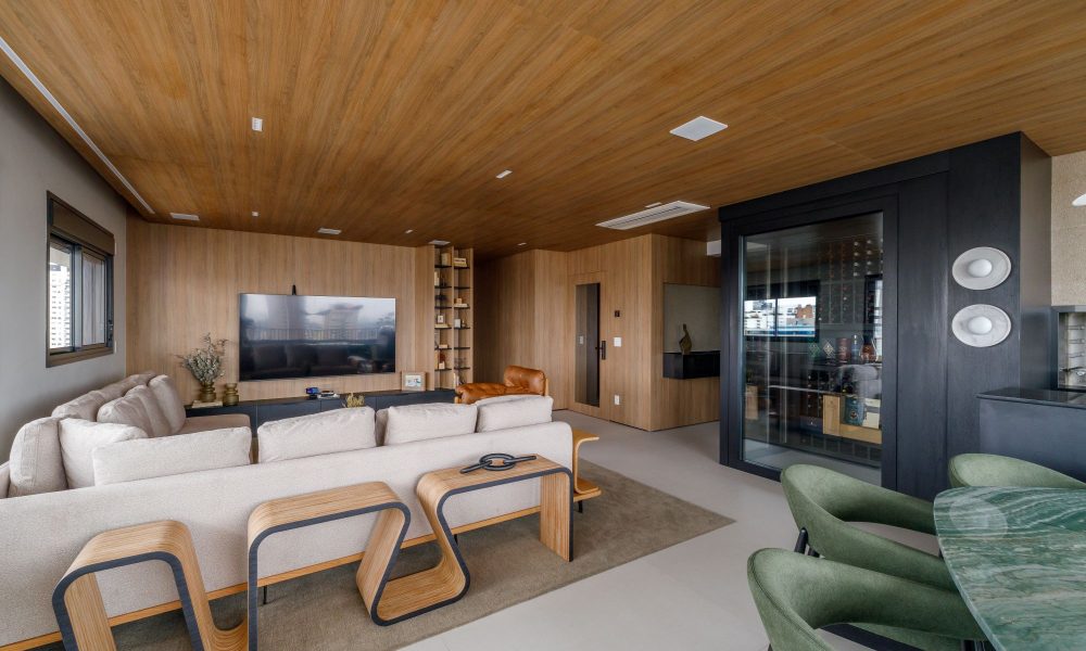 Com linhas limpas, marcenaria sob medida da Kitchens, paleta neutra e materiais sofisticados, o projeto aposta em uma linguagem contemporânea. A madeira aparece em forros, painéis e mobiliário, trazendo equilíbrio entre elegância e aconchego. A iluminação cênica e as texturas sutis suavizam a estética minimalista e garantem ambientes acolhedores.