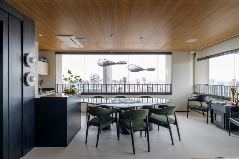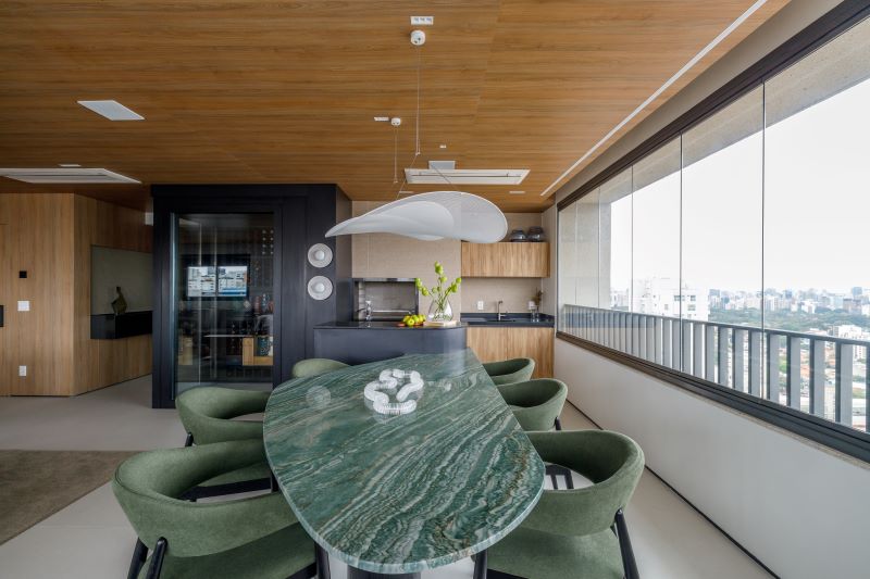 Na área social, a integração entre sala de estar, varanda gourmet e sala de jantar cria um espaço amplo e fluido, ideal para receber. O forro em madeira aquece visualmente, enquanto a iluminação personalizada cria atmosferas variadas. Os móveis com tampos orgânicos foram desenhados exclusivamente para o projeto, reforçando seu caráter autoral, além do grande destaque da sala de estar a clássica poltrona Mole, do designer Sérgio Rodrigues.