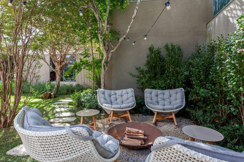 Nos fundos do terreno, a edícula abriga uma academia de 80 m² com vestiário, complementando a proposta de bem-estar. Já o spa, inicialmente não previsto, foi implantado no espaço dos antigos depósitos. Com pequenas alterações no layout, o ambiente foi adaptado para criar um refúgio intimista, com granilite no piso, tijolos cerâmicos e texturas nas paredes e no teto, tudo com iluminação indireta. “A arquitetura está nos gestos, nos materiais e também nas experiências. Cada espaço da casa foi desenhado para se adaptar ao cotidiano, com soluções que priorizam bem-estar, estética e praticidade, sem abrir mão da elegância”, completa Bia.