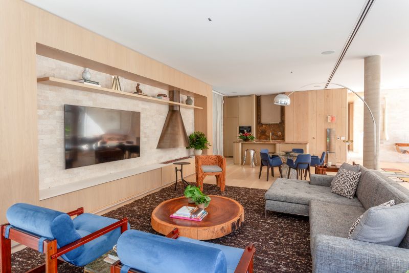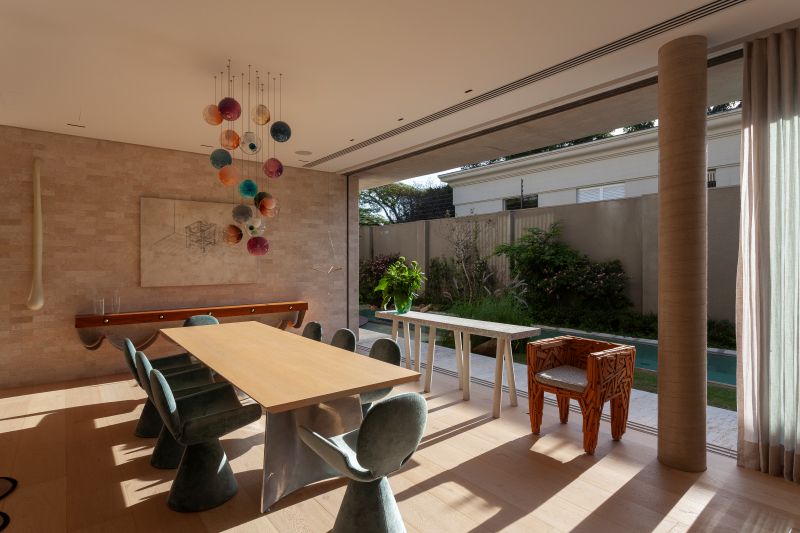 A residência é marcada por uma linguagem contemporânea, com escolhas arquitetônicas e materiais que transmitem conforto e sofisticação. A fachada é revestida em tijolo travertino da Palimanan, enquanto tábuas largas de carvalho europeu (30 cm) da Parket foram aplicadas nos pisos e forros, inclusive no hall de entrada com pé-direito duplo e teto em duas águas. “Desde o início, o pedido era claro: uma casa que fosse acolhedora, funcional e que aproveitasse ao máximo a luz natural. Buscamos integrar os espaços internos aos jardins para criar essa atmosfera de refúgio urbano, onde cada detalhe dialoga com a arquitetura e com a rotina da família”, explica a arquiteta Bia Prado.
