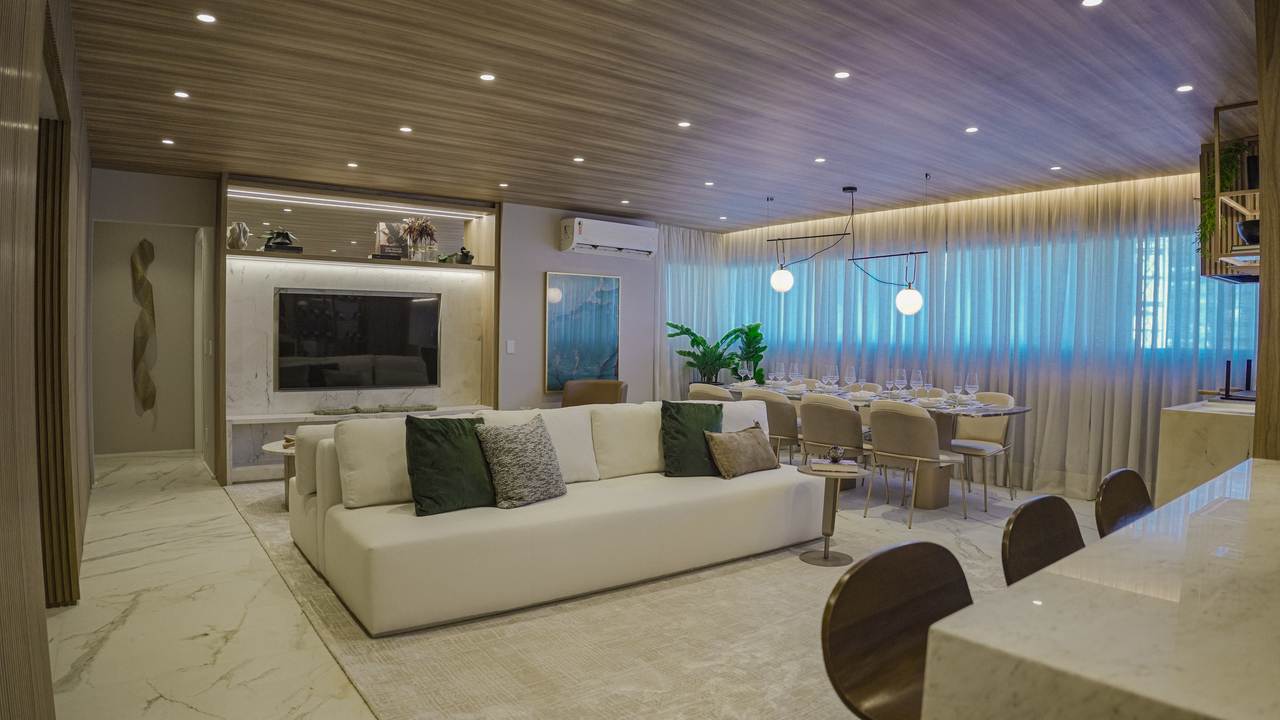 O living integra estar, jantar e cozinha com fluidez, em um ambiente amplo e visualmente coeso. A madeira assume protagonismo no teto e em painéis que revestem as paredes, conferindo aconchego ao espaço. A paleta neutra, combinada a peças de design contemporâneo, tecidos claros e toques pontuais de verde, reforça a proposta de um ambiente elegante, funcional e atemporal. Elementos como iluminação indireta e revestimentos naturais evidenciam o cuidado meticuloso na composição.
