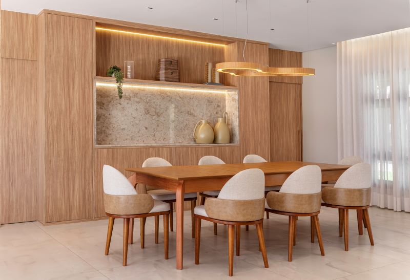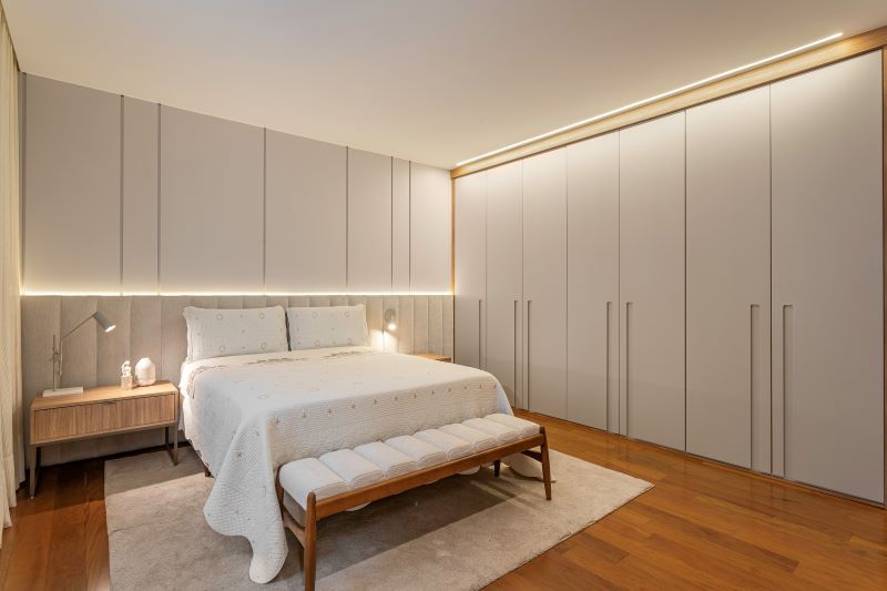 A marcenaria da Celmar teve papel essencial na materialização do projeto. Mais do que mobiliário, as soluções desenvolvidas trouxeram funcionalidade e sofisticação aos ambientes. Todas as peças foram pensadas sob medida, com atenção especial aos detalhes: iluminação embutida, sistemas de abertura discretos, integração com eletrodomésticos e revestimentos, além de acabamentos que dialogam com a linguagem do projeto.