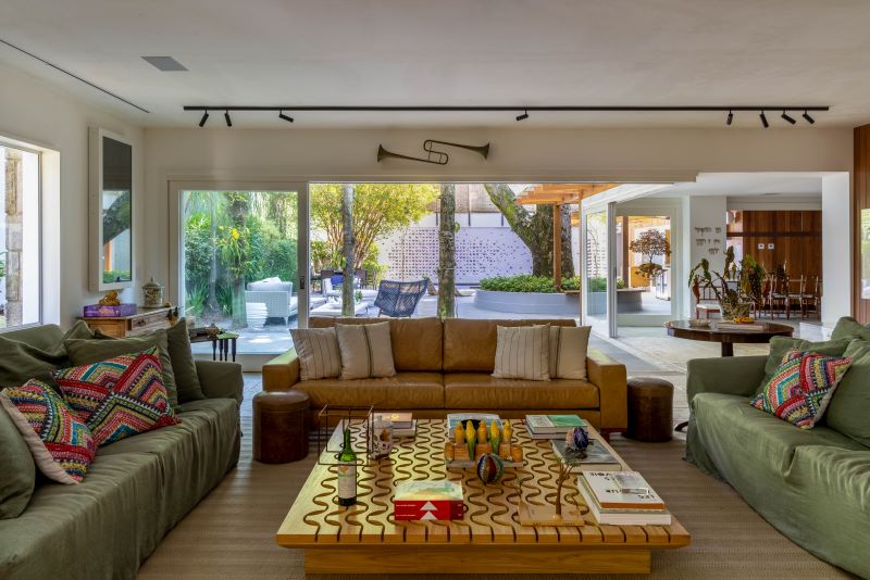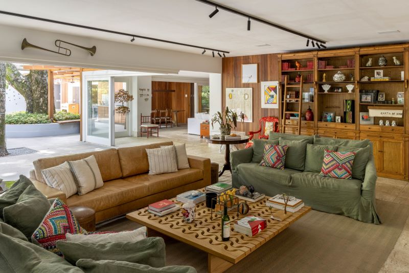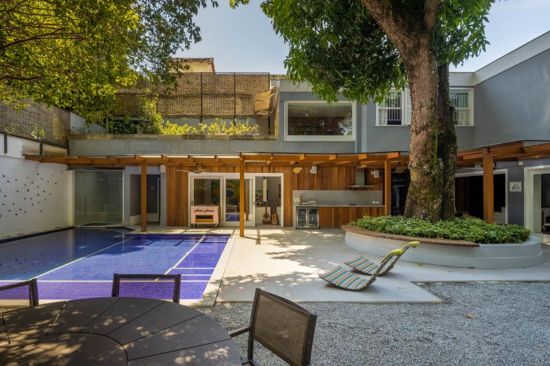 Na área externa, Mauricio criou uma pérgola que permitiu fazer uma bancada com churrasqueira e adega, além de uma área gourmet. O espaço fica em frente  à piscina, que ganhou um charmoso painel de azulejos de Miguel Sereno. Já a ala social interna ficou com um estar amplo também conectado ao jardim. Ali, a decoração aproveitou tanto o mobiliário como as obras de arte e objetos que o casal já colecionava, dando ao ambiente a personalidade que a família tanto desejava.